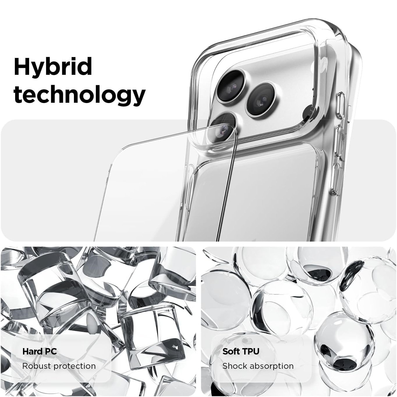 Die Hülle kombiniert zwei sorgfältig ausgewählte Materialien zu einem perfekten Hybrid-System: eine harte Polycarbonat-Rückseite (Hard PC) für robusten Aufprallschutz und einen flexiblen TPU-Rahmen (Soft TPU) für stoßdämpfende Elastizität. Diese durchdachte Kombination sorgt dafür, dass dein Smartphone nicht nur sicher vor Stürzen und Kratzern ist, sondern sich auch angenehm griffig anfühlt. Die transparente Oberfläche bleibt klar und widerstandsfähig, während die Ecken gezielt Aufprallenergie absorbieren – für maximalen Schutz bei minimalem Gewicht.