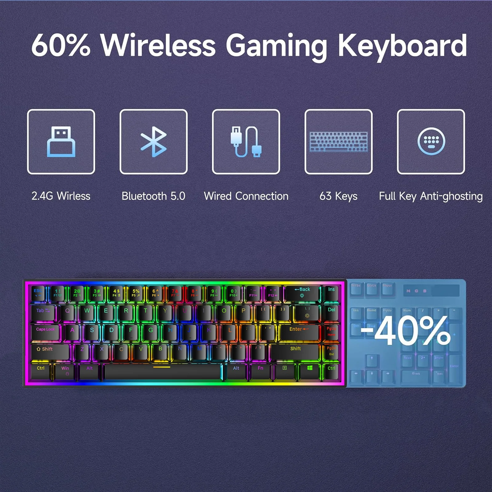 Kabellose Gaming-Tastatur mit RGB-Beleuchtung – 61 Tasten