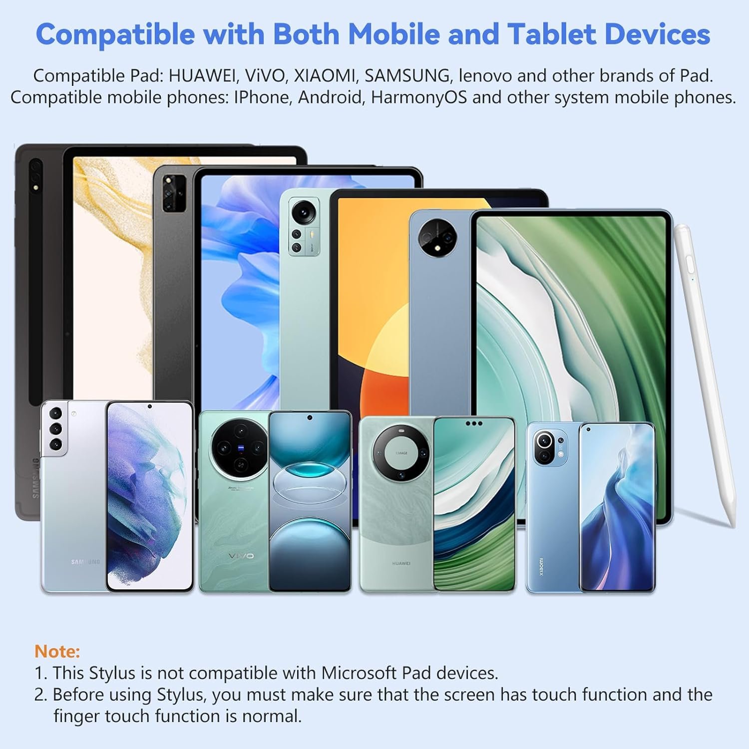 Der Stylus ist **universell einsetzbar** und unterstützt eine Vielzahl von Android-Tablets und Smartphones, darunter **Samsung, Huawei, Lenovo, Xiaomi, Vivo** und viele weitere Marken.